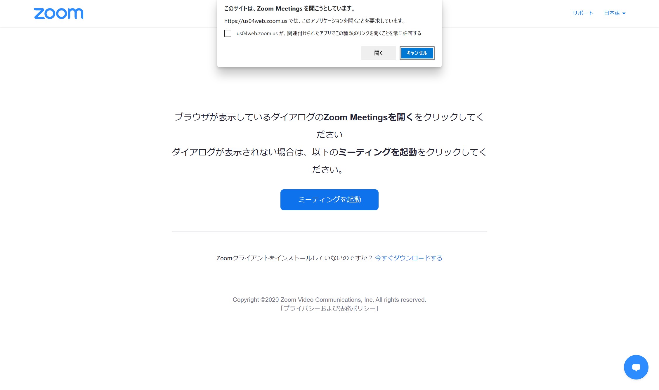 3.アプリのダウンロードが完了したら、ブラウザに戻り「ミーティングを起動」をタップしてください。