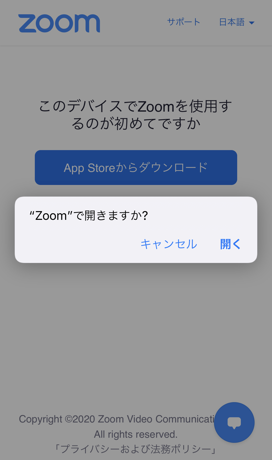 4.以下のような画面が表示されますので、「開く」をタップし、Zoomアプリを開いてください。